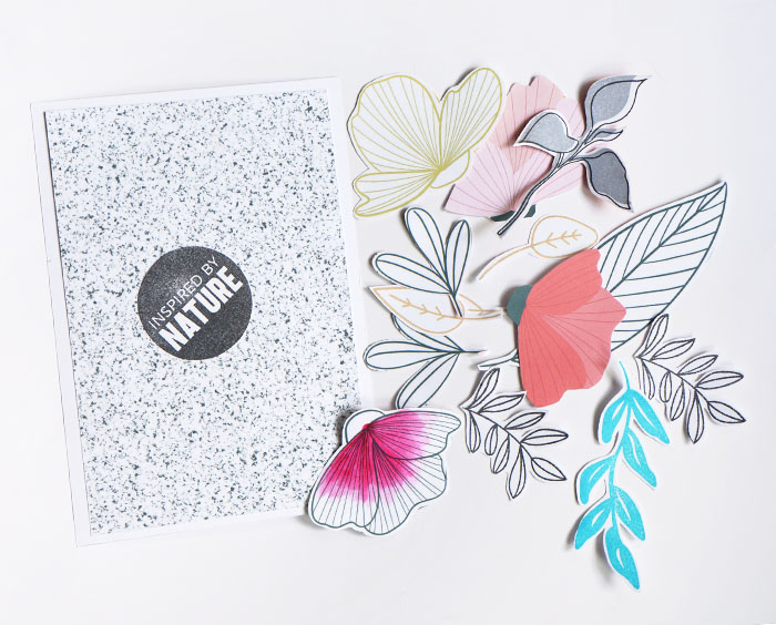 Ici, mon point central est le tampon rond Inspired by nature de la collection Comme un air de printemps, placé sur de la mousse 3D par dessus tout un bouquet de fleurs et de feuilles.